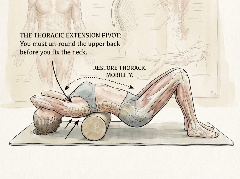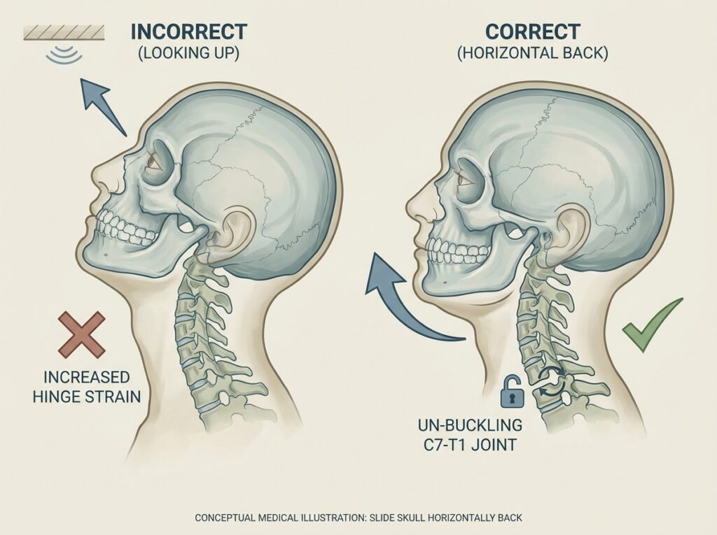 But your eyes still need to stay level with the horizon. So your lower neck compensates by bending backward—right at the C7–T1 junction.