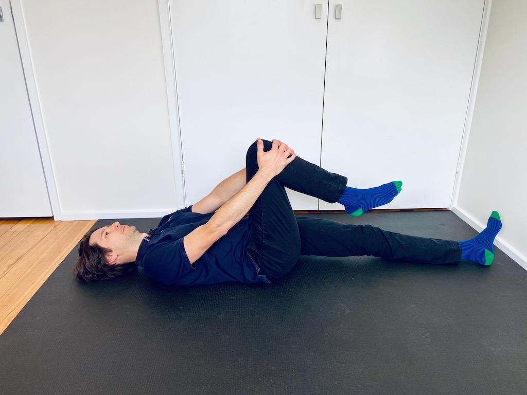 Lie on your back and pull one knee toward your chest. Hold, then switch.
