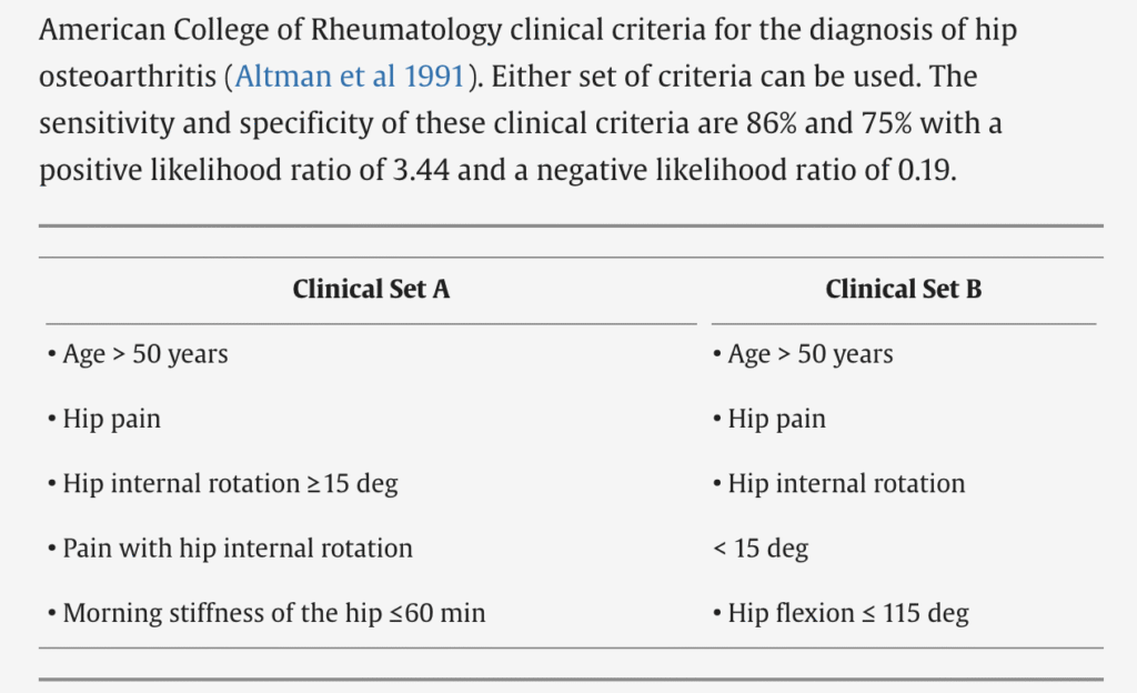 - Clinical Set A: Age >50, hip pain, internal rotation ≥15°, pain with IR, morning stiffness ≤60 min.